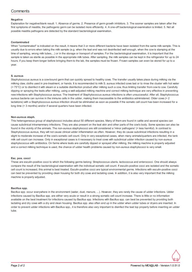 You don't have to write your own texts anymore and type or copy the same explanations in every report over and over again. From now on a default text will appear in the report for each diagnosis. Useful information for the producer about the virulence of the pathogen, the prevalence of the pathogen and possible prevention measures are included in every report. This additional information can be found at the very end of the report. As a result, you can now use the entire advice field to formulate a clear and unambiguous (treatment) advice tailored to each specific cow.